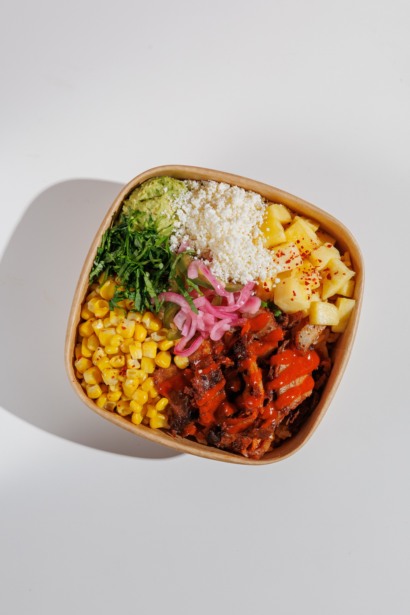 Pork trompo, orange mojo rice, sweet corn, salsa verde, guacamole, pineapple, jalapeño onion relish, queso fresco, cilantro