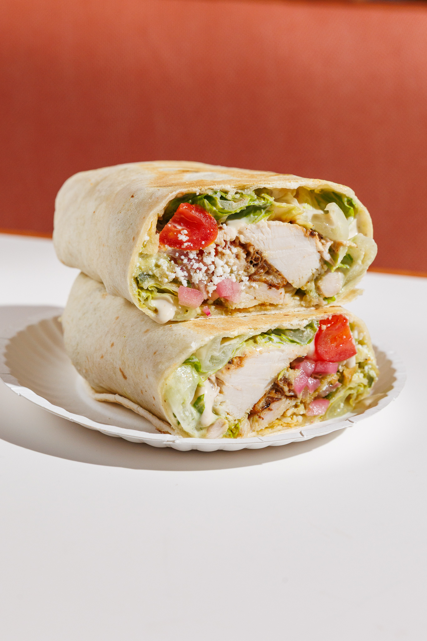 Fresh and satisfying, wrapped in a warm flour tortilla with juicy rotisserie chicken, crisp romaine hearts, grape tomatoes, salsa verde, crunchy tortilla chips, lemon garlic dressing, queso fresco, and cilantro. Bright, crunchy, and full of flavor.
