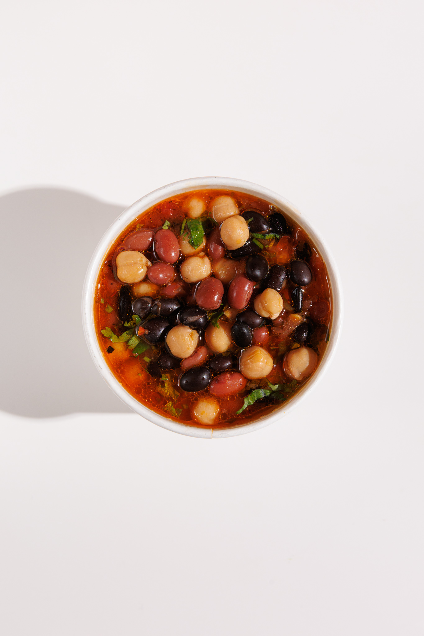 red, black and garbanzo beans in a tomato broth